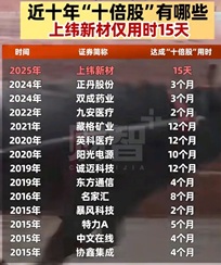 盘点最近十年,涨幅超十倍的个股有哪些,用了多久时间。 2015年-协鑫集成用了4个月 2015年-中文在线用了4个月 2015年-特力A用了5个月 2015年-暴风科用了2个月 2016年-名车汇用了8个月 2019年-东方通信用了4个月 2019年-诚迈科技用了12个月 2020年-阳光电源用了12个月 2021年-藏格矿业用了12个月 2022年-九安医疗用了2个月 2024年-双成药业用了3个月 2024年-正丹股份用了3个月 最后一个就是今年的王者,上纬新材涨幅超15倍用时只用15天时间