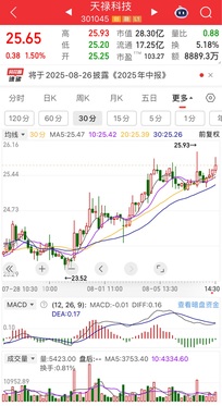 天禄*技,从30分时形态看,突破中枢箱体,粘合均线开始形成向上发散,沿着5日线观察,下方有个小w底形态,颈线为支撑防守不破,跌破转防守策略!目前MACD也成就了金叉形,让它继续飞,财哥继续等。$天禄科技 sz301045$ S天禄科技(sz301045)S
