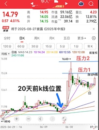 今天再给大家分享一个知识点:均线粘合(变盘讯号)+一眼识别均线支撑。 【华人】也是之前给大家观察的票,结构没问题,说白了无非就是买点的问题。大家要知道均线粘合,传递给我们的信息是什么?均线粘合意味着变盘选择方向,这个大家应该很熟悉吧!分析大盘的时候,我经常说的一句话。当然了,变盘有两个方向,向上或向下的问题。 怎么判断向上的概率更大? 首先,大阳线突破关键压力(转折阳),横向震荡半个月,股价回到20日线附近,如何判断20日线有没有强支撑?很简单,数一下20天前的K线位置,如图所示,倒数20天前的