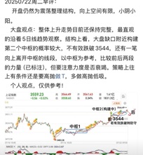 20250722周二早评: 开盘仍然为震荡整理结构,向上空间有限,小阴小阳。 大盘观点:整体上升走势目前还保持完整,最直观的沿着5日线趋势观察。结构上看,大盘缺口附近构建第二个中枢的概率较大,不有效跌破3544,还有一笔向上离开中枢的线段,以中枢为参考,比较前后两段的力量,但要注意力度是否衰竭。策略上往上有条件还是要高抛做T,多做高抛低吸。 个人观点,仅供参考!