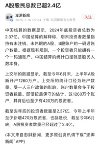 最新数据:中国股民突破2.4亿,新股民90后00后居多。 ……… 根据最新数据显示,截止2025年6月底,中国股民正式突破2.4亿,而且只包含不注销,不休眠的账户。 在新增的账户中,自然人占比99%以上,机构占比非常小,主要以90后和00后为主,体现了年轻客户对财富管理的喜爱。俗话说你不理财财不理你,钱多钱少都需要一个好的理财方法,有了钱你才可以去做自己想做的事。 客观的讲,炒股是一个非常不错的职业,门槛低,时间自由,任何事都是自己说了算,而且每天只需工作4个小时,周末节假日全休息,当然,能不能