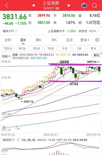 2025-9-18周四收评: 一阴破三线,放量大跌,调整来了! 周四大盘波动还是比较大的,昨天也有说过多空今天大概率要决出胜负,那么,答案很明显空头完胜。关键还是创新高之后,拉开不了与前高的距离,早盘最高点打到3899,其实就仅仅只是创新高几个点,我相信这句话大家应该听了很多次了,反复强调,提示,一旦站不稳,就会拉回或调整。今天盘中上下波动100个点,跌幅一度接近2%,还是挺恐怖的。 技术面看,大盘一阴破三线,macd倒鸭嘴,这是一个比较不好的讯号,加速向下,一般来说倒鸭嘴会有3-5天的调整需求
