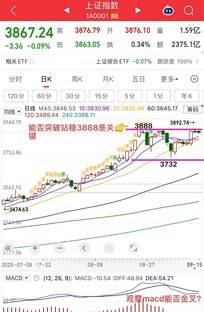 2025-9-15周一早评: 开盘15分钟观察,今日震荡整理为主,小k线概率,小阴小阳结构。 大盘观点:大盘上周创了波段新高,但总体还在大的中枢箱体之内运行,从大的结构上看,关键是能否真正突破前高3888向上离开,若不能有效站稳3888,就还是中枢震荡,冲高可适当控制仓位来降低回调风险。 短线从3732开始的向上反弹走势,目前还未确认结束,有机会构建第二个中枢,不破3847问题就不大,还可以继续向上,但往上需注意力度是否背驰,仅仅只是创新高几个点是不够的,防背驰冲高回落。 这里有一个关键的压力位