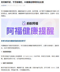 6月面世的AQ昨天(12月15日)全面升级为“蚂蚁阿福”,同步发布App新版本,升级健康陪伴、健康问答、健康服务三大功能。从工具进化为AI医生朋友,蚂蚁阿福App上线数月月活即突破1500万。 今晚一举成为苹果商店下载量免费榜第二。 央视财经,央视新闻亲自下场打CALL! 今晚央视新闻最新文章,央妈call你用蚂蚁阿福! 央视财经,新京报,都在强call蚂蚁阿福。 截止发文时间,蚂蚁阿福下载量已经从第三变成了第二。 取名“阿福”寓意健康是福,健康的事就找“阿福”。蚂蚁集团副总裁、蚂蚁健康事业群总