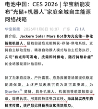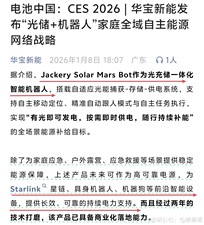 S华宝新能(sz301327)SS震有科技(sh688418)SS金风科技(sz002202)SS蓝色光标(sz300058)SS航天电子(sh600879)S 1月8日,华宝新能官号显示,公司在CES上发布“光储机器人”,为Starlink星链提供长效可靠电力支持。 华宝新能已经作为Starlink供货商,为其提供相关产品。马斯克在10月12日推特上点赞了华宝新能的Jackery电小二光充户外电源系列Jackery Explorer 240及配套的Jackery100W光伏太阳能板。 Star