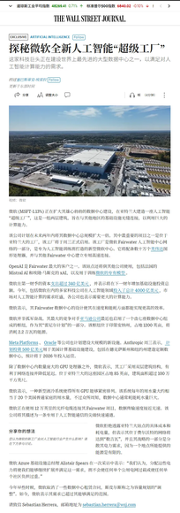 微软计划在未来两年内将其数据中心总规模扩大一倍。其中最重要的项目之一是位于亚特兰大的工厂,该工厂将于周三正式启用。该工厂是微软 Fairwater 人工智能中心网络的一部分,是专为人工智能训练而打造的新型微软中心。它将配备数十万个英伟达图形处理器,并与其他 Fairwater 中心建立专用高速连接。 华尔街日报:微软全新人工智能“超级工厂” 微软计划在未来两年内将其数据中华尔街日报:微软全新人工智能“超级工厂” 微软计划在未来两年内将其数据中华尔街日报:微软全新人工智能“超级工厂” 微软计