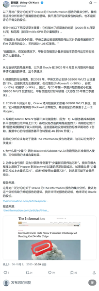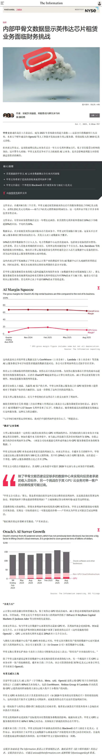 转,美股AI板块集体跳水,鬼故事来了。 起因是 The Information 刚发的一篇关于甲骨文的最新独家报道,建议大家去看看原文。 下面总结下报道的一些要点, 1,上季度出租英伟达 Blackwell 芯片亏损近1 亿美元,出租英伟达芯片服务器营收约9 亿美元,毛利率仅14%。 2,14% 的毛利率已计入数据中心人力、电力及部分设备折旧成本,而其他未明确的折旧费用还会进一步侵蚀 7 个百分点的利润。 3,该业务过去一年毛利率平均约16% ,且未来公司整体毛利率将从近年的70% 大幅下滑。
