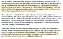 这里,让我跟你分享一些事情。亚马逊目前正在亚特兰大建设一个项目。这是一项110亿美元的投资。它将成为一个巨大的AI中心,全新的,不是改造的,全新的。那么,你认亚马逊难道还没有为那个数据中心预留位置吗?当然有了。这对亚马逊来说没有任何风险。对于那110亿美元来说,也没有风险。他们已经知道,如果他们选择在亚特兰大建设客户就会来,预订是现成的,他们可以在几年内实现盈利。他们将会收回所有的投资。 他们需要处于类似的境地。他们需要理解客户需求并对此有所准备。如果不具备这些条件他们就在那个应用数字空间里了,