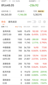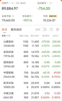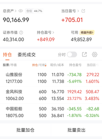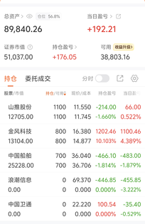 平仓了结:金风科技 加仓:中国船舶 今天消费起飞了,锂电继续强势,证券也很好,大盘又4000点了,明天可能又有新高了。 金风股东一直减持,周末又发减持公告,拿着心惊胆战的,平仓了,其实周末已经想好怎么操作了,结果开盘又犹豫不决,多亏了2个点。中午消息美国暂缓船舶调查,加仓了中国船舶。 现在还是轮动,卖涨买跌,周五加仓,今天吃面。大A不看业绩,业绩好不涨,业绩不好大涨。
