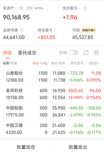 减仓:金风科技,中国船舶 加仓:山推股份 今天市场表现的还不错,上午水下震荡,下午一路往上,3500家红。文化传媒表现很亮眼,可能是受AI短剧的影响。海南板块也不错,在12月18封关前,应该会走趋势。 但大盘仍受5日线压迫,不敢太激进。所以今天把上周五加仓的金风和船舶减了,如果今天大盘能突破并站稳5日线的话,金风和船舶今天的形态应该是我的加仓位。山推今天加仓的莫名其妙,形态也不好,也没有等到上涨确认的信号,就主观感觉是在洗盘吸筹。 免责声明:本帖只用作个人记录,不作为投资建议!