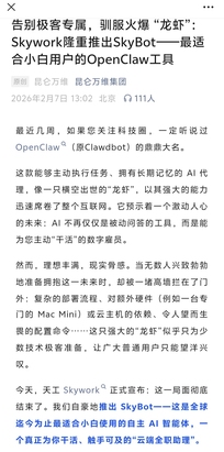 事件概述:精准卡位AI Agent风口 昆仑万维旗下天工Skywork于2026年2月7日推出AI智能体SkyBot,定位全球最适合小白的OpenClaw解决方案。在OpenClaw(原Clawdbot)凭借GitHub星标10天破10万成为现象级产品的背景下,SkyBot提前一个月卡位风口,将OpenClaw能力彻底普惠化。 产品解析:三大痛点破解实现全民化 SkyBot直击OpenClaw三大核心痛点,实现从极客工具到全民助理的跨越: 1. 部署门槛归零:采用100%云端运行,用户无需准备M