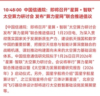中国信通院:即将召开"星算.智联"太空算力研讨会 发布"算力星网"联合推进倡议 【中国信通院:即将召开"星算.智联"太空算力研讨会发布"算力星网"联合推进倡议】1月23日电,为深入贯彻落实国家关于发展新质生产力、建设航天强国和数字中国的重要部署,把握空天信息与智能计算深度融合的战略机遇,谋划推动构建面向未来的太空算力基础设施体系。中国信息通信研究院拟于1月26日召开2026年"星算.智联"太空算力研讨会。会议将举行"算力星网"联合推进倡议暨《太空算力发展前瞻研究报告(2026年)》启动仪式。另外