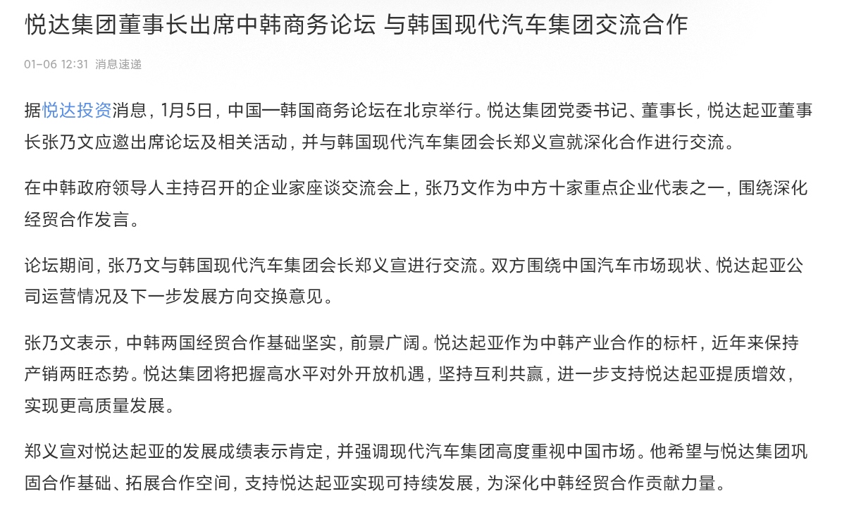 因市场猜测现代汽车与英伟达达成合作现代汽车股价上涨15%创历史新高 据悦达投资消息,1月5日,中国一韩国商务论坛在北京举行。悦达集团党委书记、董事长,悦达起亚董事 长张乃文应邀出席论坛及相关活动,并与韩国现代汽车集团会长郑义宣就深化合作进行交流。 在中韩主持召开的企业家座谈交流会上,张乃文作为中方十家重点企业代表之一,围绕深化 经贸合作发言。 论坛期间,张乃文与韩国现代汽车集团会长郑义宣进行交流。双方围绕中国汽车市场现状、悦达起亚公 司运营情况及下一步发展方向交换意见。 张乃文表示,中韩两国经贸