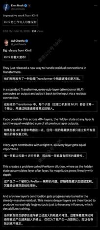 事件:Kimi 的重大发布! 1、他们刚刚发布了一种处理Transformer中残差连接的新方法。在标准的Transformer中,每个子层(注意力机制或MLP)都会计算个输出,并通过残差连接将其加回输入。如果你在40多层中考虑这一点,任何一层的隐藏状态都只是之前所有层输出的等权重之和。每一层都以权重=1进行贡献,因此每一层都具有同等的重要性。这产生了一个被称为PreNorm稀释的问题,即随着隐藏状态层层累积,其量级会随深度线性增长。任何新层的贡献都会逐渐被已经庞大的残差所掩埋。这意味看更深的网
