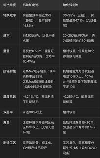 钙钛矿电池更适合的场景: 商业航天低轨卫星:凭借低成本、轻量化优势,在近地轨道商业卫星等风险较低场景具有显著成本优势 大规模星座部署:OneWeb第二代卫星计划全部采用钙钛矿电池,单星光伏系统成本从84万降至31万,推动星座建设总成本下降26% 太空数据中心:太空无氧无湿环境能规避钙钛矿电池地面易降解的缺陷,衰减速率降至地面1/10,寿命可延长至15年以上 柔性应用场景:可卷曲、可折叠、可大面积覆盖,适配下一代卫星与太空平台 砷化镓电池更适合的场景: 深空探测任务:抗辐射能力极强,在火星车、深空