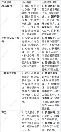 本篇文章覆盖了多个重点行业,包括AI与算力、半导体、新能源(储能、锂电)、固态电池、化工材料、计算机与软件、军工、消费电子与机器人等。 趋势分析基于供需关系、政策催化、技术突破和业绩验证等逻辑推理。 以下按产业领域力求进行准确、完整、清晰的总结和表述: 一、AI与算力趋势 1. 趋势分析: - 国产算力芯片(如昇腾950PR、寒武纪690)将于2026年上半年集中落地,推动国产算力生态加速发展。 - 国内云服务提供商(CSP)的AI算力采购滞后北美约一年,但2025年起将大幅增加投入,2026年