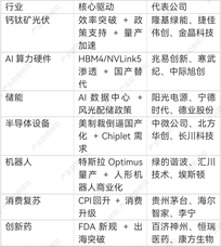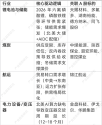 文章内容涵盖了多个行业的驱动因素(即推动行业发展的核心逻辑)以及与之关联的A股标的。整体市场投资逻辑围绕“供需紧平衡、国产替代、区域出海与技术革新”展开。 以下按行业分类总结驱动逻辑及关联A股: 整体市场驱动逻辑 - 核心主题:供需紧平衡、国产替代、区域出海、技术革新。这四大主题贯穿多数行业,尤其在周期性(如煤炭、航运)和成长性领域(如AI、储能)表现明显。 - 宏观背景:美国电力短缺、AI算力需求爆发、全球能源转型、政策驱动(如中国反内卷政策、美国ITC补贴)等,共同推动结构性机会。 分行业驱