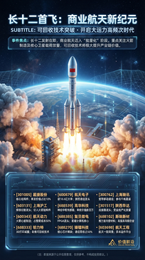 长征十二号的首飞,标志着中国商业航天正式迈入“批量化”与“高频次”发射的全新时代。 此次发射不仅是运载能力的突破,核心在于其对可回收技术的验证,这将大幅降低进入太空的成本,从而极大地提升整个产业链的商业价值。 从投资与产业逻辑来看,本次事件将深度利好三大核心领域的领军企业: 核心结构与动力:火箭制造是重中之重。其中,航天动力掌握火箭“心脏”制造,占整箭成本一半;超捷股份与上海沪工切入核心结构件;铂力特则以3D打印技术助力箭体减重与回收。 电子与控制系统:作为火箭的“大脑”与“神经”,航天电子、复