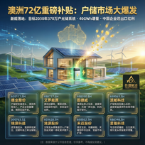 在经历了去库存的阵痛期后,全球户用储能(户储)市场终于迎来了一针强心剂。 近日,澳洲市场传来重磅利好——72亿规模的重磅补贴新规正式落地,明确将“光储系统”作为未来的能源核心。这一政策不仅划定了到2030年实现370万户光储系统安装的宏大目标,更直接锁定了40GWh的市场增量。 对于在全球储能产业链中占据绝对统治地位的中国企业而言,这不仅仅是一个数字,更是一场关于“出海红利”的又一次盛宴。 一、 政策风口:澳洲为何突然“撒钱”? 澳洲一直是全球光伏渗透率最高的国家之一,被称为“屋顶上的国家”。然