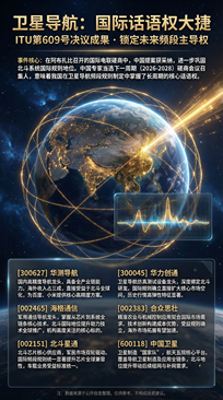 近日,在阿联酋阿布扎比召开的国际电信联盟(ITU)磋商会议传回重磅捷报。中国在卫星导航领域的提案不仅获得采纳,更成功拿下了下一周期(2026-2028)磋商会议召集人的席位。这一看似晦涩的技术性胜利,实则是中国从“航天大国”向“航天强国”迈进的关键里程碑。它意味着中国在卫星导航频段规则制定中掌握了核心话语权,标志着北斗系统全球化应用扫清了最大的制度障碍。本文将从地缘战略、技术逻辑、市场空间及核心受益标的四个维度,深度拆解这一事件背后的万亿级投资机会。 一、事件复盘——不仅仅是技术胜利,更是主权延