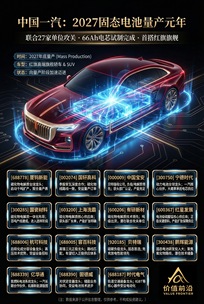 在新能源汽车行业进入“下半场”的今天,如果说智能化是决胜的“大脑”,那么固态电池无疑是决定生死的“心脏”。近日,作为“共和国长子”的中国一汽发布了一张震撼行业的重磅海报——《中国一汽:2027固态电池量产元年》。 这不仅仅是一个时间表的公布,更是中国汽车工业在下一代能源技术上吹响的冲锋号。这一消息如同向平静的湖面投下了一颗深水炸弹,在资本市场和产业界激起了千层浪。本文将深度拆解这张海报背后的技术路线、战略意义,并重点梳理图片中提及的核心产业链标的,为您呈现一份详尽的固态电池投资与产业观察报告。