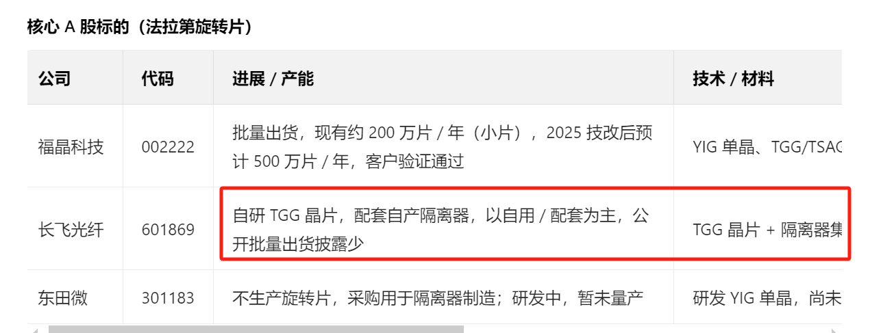 隔离器的东田微大涨,但隔离器的紧缺本质上是法拉第光旋转片大卖家的控制。长飞光纤官网显示,长飞光纤生产的TGG 晶体产品是制作法拉第旋光器和隔离器的最佳磁光材料。用于生产光隔离器、法拉第旋光器。https://www.yofc.com/view/2533.html字