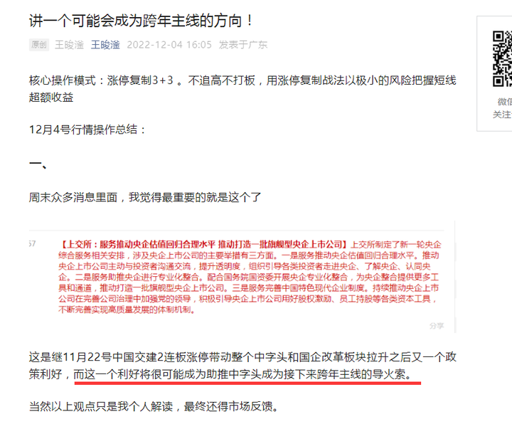 核心操作模式:涨停复制3+3 。不追高不打板,用涨停复制战法以极小的风险把握短线超额收益 12月4号行情操作总结: 一、 周末众多消息里面,我觉得最重要的就是这个了 这是继11月22号中国交建2连板涨停带动整个中字头和国企改革板块拉升之后又一个政策利好,而这一个利好将很可能成为助推中字头成为接下来跨年主线的导火索。 当然以上观点只是我个人解读,最终还得市场反馈。 二、 一个观点肯定得有逻辑支撑才能站住脚,我们就简单的去解读一下这段话的大体几个意思 1、推动央企估值水平回归合理 2、推动央企和投资