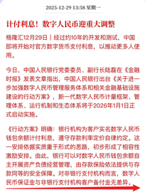 计付利息!数字人民币迎重大调整 格隆汇12月29日经过约10年的开发和测试,中国即将开始对官方数字货币支付利息,以推动更多人使用。 今日,中国人民银行党委委员、副行长陆磊在<<金融时报>>发表文章指出,中国人民银行出台<<关于进一步加强数字人民币管理服务体系和相关金融基础设施建设的行动方案>>,新一代数字人民币计量框架、管理体系、运行机制和生态体系将于2026年1月1日正式启动实施。 <<行动方案>>明确:银行机构为客户实名数字人民币钱包余额计付利息,遵守存款利率定价自律约定。这一安排依据实质重