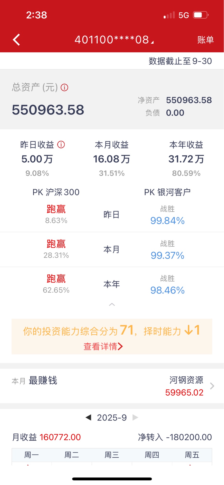 九月收官,本月战胜99.37%的股民,本月收益16.08万,本年战胜98.46%的股民,本年收益31.72万。融资平台已经开通,这个业绩是否还会增长,让我们持续关注。