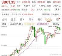 又要开盘了,那就简单说下吧!我感觉今天会由权重方向带领大盘上攻,那么对应的就是黑线在上,黄线在下了! 大盘压力位我们就看3875点,所以需要关注量能的变化,也就说今天拉升冲击这里成交量要增加,不然又会冲高回落,想要突破今天的成交量要超过2.6万亿 昨天证券板块有明显的资金介入的痕迹,今天很有可能还会再次上攻! 明天凌晨消息就落地了,消息落地资金也就没有牵挂了,那么后面的自然走势反而就更好判断了! #中概指数创3年新高#