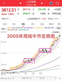 回顾历史,虽不会简单的重复,但走势结构总是相通的。 新的一周又要开始了,每周都还是得看一下周k线的走势,回顾历史2005与2014年两波牛市。 基本上,趋势一旦形成,在牛市的结构里,调整方式很简单,就是选择横盘震荡做中枢,用时间来代替向下调整的空间,在日线结构体现出来的,就是围绕大的箱体上下震荡。 从均线的角度看,一般来说,就是回踩10周均线较多,20日线几乎都不会去碰,这说明什么?说明在牛市行情中,调整的方式不是以空间为代价,多半选择震荡的方式来完成