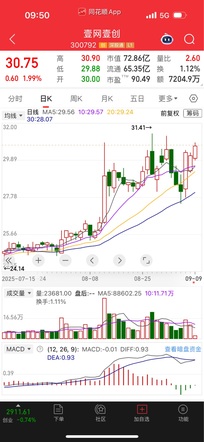 壹网壹创,盘中触及最高31.88,如何今天下午,不把这个对子数破掉,邱小姐将考虑下车走人,对子数不喜欢。 S壹网壹创(sz300792)S