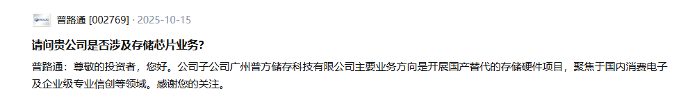 请问贵公司是否涉及存储芯片业务?普路通:尊敬的投资者,您好,公司子公司广州普方储存科技有限公司主要业务方向是开展国产替代的存储硬件项目,聚焦于国内消费电子及企业级专业信创等领域。感谢您的关注。 人民财讯,7月21日电,企查查APP显示,近日,广州普方储存科技有限公司成立,注册资本1000万元,经营范围包含:集成电路芯片及产品制造;集成电路芯片设计及服务;集成电路芯片及产品销售等。企查查股权穿透 显示,该公司由普路通(002769)全资持股。