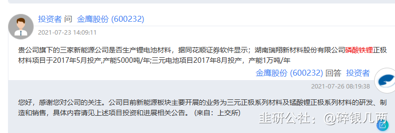 金鹰股份:公司有固态电池富锂锰基正极材料,三元正极系列材料的研发、制造和销售