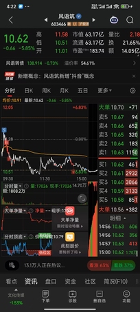 风语筑 收评记录 个人操作记录与心态。 我在早盘的时候就冲高就清掉了一半仓位,开跌后开始做t,在这个点位上,不知道会不会上去,下去的可能高,但也可能下去,我不能绝对判断,所以只清了一半,即使上去也有仓位,下去了就做t,当下时刻不敢全清了,结果还是往下坠,拉萨天团效应+现金提现日,即使昨晚官微发布了一个商业航天的相关文章,想靠近这个概念,还有加入抖音概念,也是抵不住今天的调整,在上午与下午盘中分别买入了六笔,想着也许会打出双尖形态,连续下跌分别买入,最后在2点钟小山坡,卖出部分,以及在尾盘能卖的股