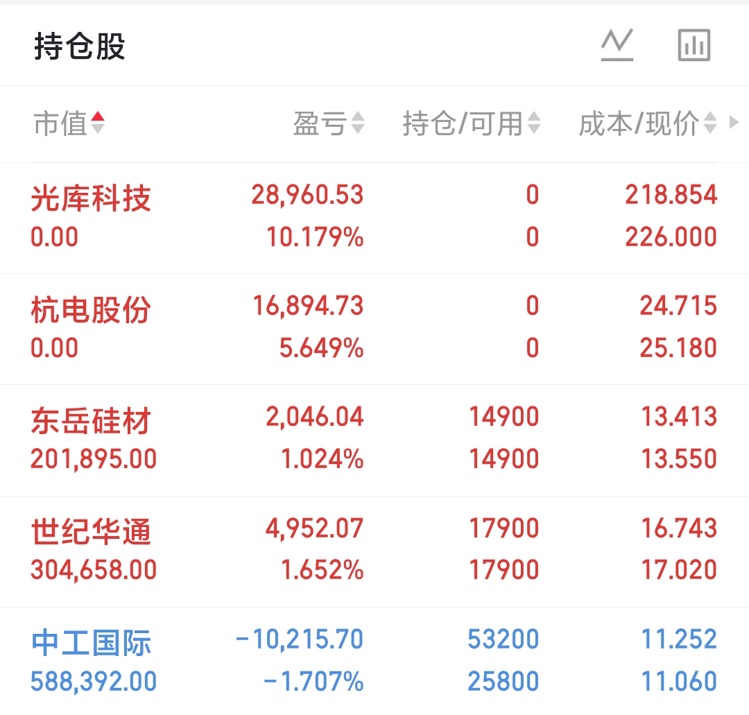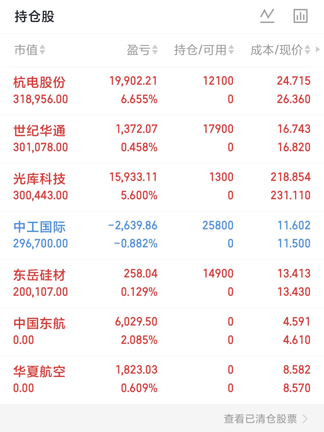 收盘了,昨天进的两只票,虽然给了点小肉 但反馈不大,丁哥直接就清仓了 资金得高效轮动起来,快进快出才是王道 S杭电股份(sh603618)S S光库科技(sz300620)S S世纪华通(sz002602)S 今天新建的仓位有点多,但承接都还不错 大部分都已翻红,总体来说还是挺满意的 今天的回调,市场在测试底线 只要承接力度还在,这波就是主力在洗盘 大势已定,接下来就看谁能拿得住了