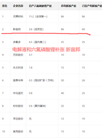 最近六氟磷酸锂涨价如火如荼,锂电材料我从9月初就开始科普,这波逻辑是急于需求超预期带来的材料涨价,包括6F,铁锂,隔膜,到最上游的锂矿等等。 电池是有正极、负极、电解液、隔膜等几个关键部分组成,而六氟磷酸锂就是电解液里面的关键材料。另外电解液里面还有溶剂和添加剂,比如DMC和VC等,石大胜华就是做这个的,而新宙邦已经全产业链了。 而新宙邦参股江西石磊公司42.83%股权,江西石磊是国内前3产能的六氟磷酸锂公司,产能为3.3万吨一年 公司已经从布局了电解液上游的素有材料的一体化生产,目前六氟磷酸锂