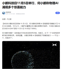 2025年10月30日,小鹏汽车官微发布消息称,将于11月5日在广州小鹏科技园举办小鹏科技日,“与你一同见证‘涌现’的力量。”小鹏汽车进一步表示,当AI跨越数字与现实的边界,未来的轮廓正在——涌现,物理AI的全新篇章,即将开启,让想象,在此刻落地。结合宣传海报来看,小鹏科技日上,小鹏汽车或将推出人形机器人相关产品。 据了解,小鹏汽车是国内较早押注人形机器人的车企,布局可追溯至2020年收购多够机器人成立鹏行智能。2023年成立机器人技术研究院后,其押注力度持续加大,将机器人列为与AI汽车、飞行汽