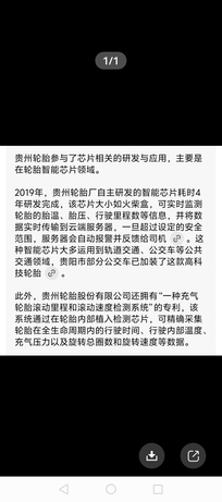 祝全体股友中秋快乐!合家安康!财源广进! AI轮胎芯片(图1)-贵州轮胎三季报业绩0.33元(其第三季度单季业绩0.16元~0.17元),全年0.45元。明年业绩0.57元-0.6元。 贵州轮胎000589自主研发的智能芯片耗时4年研发完成,该芯片大小如火柴盒,可实时监测轮胎的胎温、胎压、行驶里程数等信息,并将数据实时传输到云端服务器,一旦超过设定的安全范围,服务器会自动报警并反馈给司机 。这种智能芯片大多运用到轨道交通、公交车等公共交通领域,贵阳市部分公交车已加装了这款高科技轮胎 ,贵州轮胎0