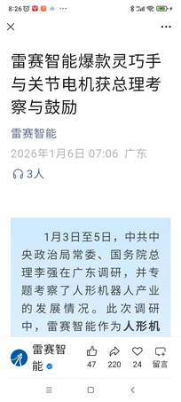 雷赛智能爆款灵巧手与关节电机获总理考察与鼓励 雷赛智能 2026年1月6日 07:06 广东 3人 在小说阅读器中沉浸阅读 1月3日至5日,中共中央政治局常委、国务院总理李强在广东调研,并专题考察了人形机器人产业的发展情况。此次调研中,雷赛智能作为人形机器人核心运动控制部件的领军企业,在深圳机器人谷向总理一行展示与汇报了公司在推动机器人技术落地应用方面的最新成果。公司展出的高性能灵巧手、空心杯电机、一体化关节模组、无框力矩电机等系列产品与解决方案,因在提升机器人运动精度、柔顺性与可靠性方面的关键