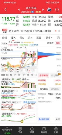 基于波长光电(301421)的综合分析,新凯莱10月15日深圳发布会将显著催化股价冲高机会,近期已形成以132.28元为压力位、111.52元为支撑位的箱体震荡格局,今日(10月14日)及周四(10月10日)的大跌为主力资金获利了结的洗盘行为,蓄力上行趋势明确。以下从技术面、资金面、消息面三维度展开,突出核心利好与短期机会。 一、技术面:箱体震荡蓄力,支撑位稳固 箱体震荡形态: 近期股价在105.7元(10月10日低点)至133.28元(10月13日高点)区间波动,形成典型箱体。 关键位: 压力