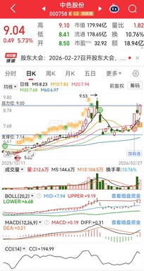 S中色股份(sz000758)S中色股份上涨可能性分析 基于技术面多指标共振(MACD金叉、CCI>100、布林带开口向上、均线发散、五日线承接)及基本面央企背景与业绩高增长支撑,中色股份(000758.SZ)已突破关键压力位,短期上涨概率极高,未来一周有望延续升势。核心驱动逻辑包括:技术面量能结构优化(放量洗盘后缩量大涨显示筹码集中)、形态类比“老鸭头”预示趋势反转、基本面资源储备与订单增长提供长期支撑。以下从技术指标、形态分析、基本面及资金动向展开。 一、技术面深度分析:多指标共振突破信号