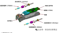一. 光模块组成 光模块是用于实现光电信号转换的光通信器件,主要结构: (1)光发射组件(TOSA):负责电转光,由激光器(DFB、VCSEL)、光学耦合元件(光隔离器、光调制器)等组成。 (2)光接收组件(ROSA):负责光转电,由探测器(PD、PIN、APD)、跨阻放大器(TIA)等组成。 (3)辅助结构:由控制电路(MCU、DSP)、光接口(连接光纤)、电接口(连接交换机)、电路板等组成。 二. 硅光技术概览 硅光技术利用硅基材料作为介质,通过CMOS工艺,将众多光电器件集成至同一芯片中;