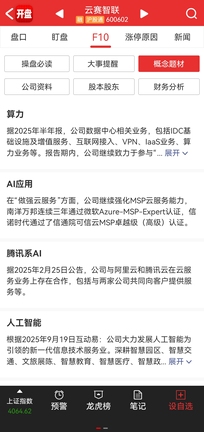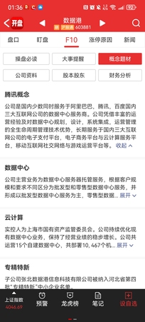 腾讯概念 公司是国内少数同时服务于阿里巴巴,腾讯,百度国内三大互联网公司的数据中心服务商。公司凭借丰富的运营经验及对数据中心规划,设计,系统集成,运营管理的全生命周期管理技术优势,长期服务于国内三大互联网公司的电子支付平台,电子商务平台与云计算服务平台,移动互联网社交网络与游戏运营平台等。 阿里系AI 据2025年10月30日上海数据港官微,数据港﹣阿里巴巴广东云计算数据中心河源集群源城机房凭借在能源高效利用、绿色低碳发展、科学布局建设及算力资源优化等方面的突出表现脱颖而出,成功入选"2025年