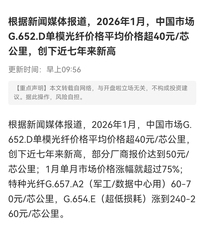 根据新闻媒体报道,2026年1月,中国市场G.652.D单模光纤价格平均价格超40元/芯公里,创下近七年来新高 通光线缆 光纤概念 江苏通光电子线缆股份有限公司主营业务为光纤光缆、输电线缆以及装备线缆三大类的研发、生产和销售。公司主要产品包括通信光缆、电力光缆、海底光电缆、输电导线、电力电缆、航空航天用耐高温电缆、通信用高频电缆、柔性电缆。公司技术处于国内领先水平,是中国光纤光缆最具竞争力十强企业、中国通信光电缆行业核心企业、中国线缆行业百强企业。 5G 收购通光信息,进军公网通讯光缆,并成为三