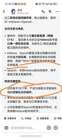 星帅尔 21年开始就做太空光伏了,审厂不如直接加大合作4年的客户订单,可靠值得信赖。很多人说看财报国外收入才3000w,那是因为是子公司的订单,按国内收入来计算。而且现在富乐新能源是名下百分百持股,不是51%,豆包的数据还有延后,现在是100%,今年刚增持了,可以全额核算业绩。举个例子,你有需求按到不找合作多年的合作商要去外面找没合作过的吗,浪费时间和财力。 目前公司市值才53亿,pe22动态,哪怕到50都不怕,为什么该股pe这么低就是踏上了spacex这条船,该股光伏占营收收入58%。 同时有