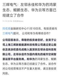 三晖电气与华为的算力合作主要通过其全资子公司上海三晖新能能源科技有限公司战略控股的深圳左邻永佳科技有限公司展开。左邻永佳作为国内领先的城市空间智慧运营平台服务商,是三晖电气与华为生态协同的核心载体。 双方在算力相关领域的合作主要体现在以下几个层面: 鲲鹏生态:左邻永佳拥有首个通过华为鲲鹏兼容性测试的智慧园区产品,其解决方案基于鲲鹏算力平台,为城市空间和工业场景提供高效、稳定的数字化底座。 华为云:左邻永佳深度依托华为云平台,提供包括设施云在内的联合解决方案,并曾荣获“华为2022年度最佳行业解决