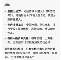 我其实比较看好的是飞驰3,春节9天假,所以博纳还是很明牌的,如果女足 澎湖定档,那么预期差加个中影,幸福蓝海。 而且在已知的春节档中下面某个明星云集的武侠大片,明星舆论矛盾比较多,而且猫眼数据也给了反馈,而且这种类型的商业武侠片群体也是比较小的。