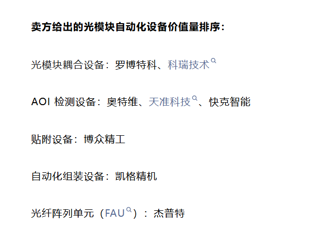 目前仅30多倍pe的半导体,cpo设备标的 相关标的罗博特科 科瑞技术 奥特维近期均大涨,同板块标的市盈率几乎都已上天 简介: 光模块领域:对于800G及以上高速光模块生产需求,设备可检测激光器芯片偏移、金线键合缺陷等关键质量问题,已在头部客户实现小批量应用。 半导体封装检测:双相机高精度模组技术方案逐步成熟,凭借亚微米级识别能力覆盖芯片封装 AOI 检测场景,可精准捕捉引线键合缺陷、封装体裂纹、光芯片波导区等问题,为半导体封装环节良率提升提供高精度AOI检测设备。 先进封装领域,热压键合(TC