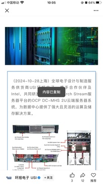 (2024-10-28上海)全球电子设计与制造服务供货商USI环旭电子,携手合作伙伴及Intel,共同研发出基于Intel Birch Stream服务器平台的OCP DC-MHS 2U云端服务器系统,为数据中心提供了强大且灵活的运算及储存解决方案。 环旭电子的服务器开发团队表示,这款全新的OCP DC-MHS 2U云端服务器系统不仅旨在提升运算性能和灵活性,还提供了未来工作负载的可扩展性。人工智能(AI)是这款服务器系统的关键应用领域之一,它能够处理大规模的AI计算需求,为数据密集型的AI应用